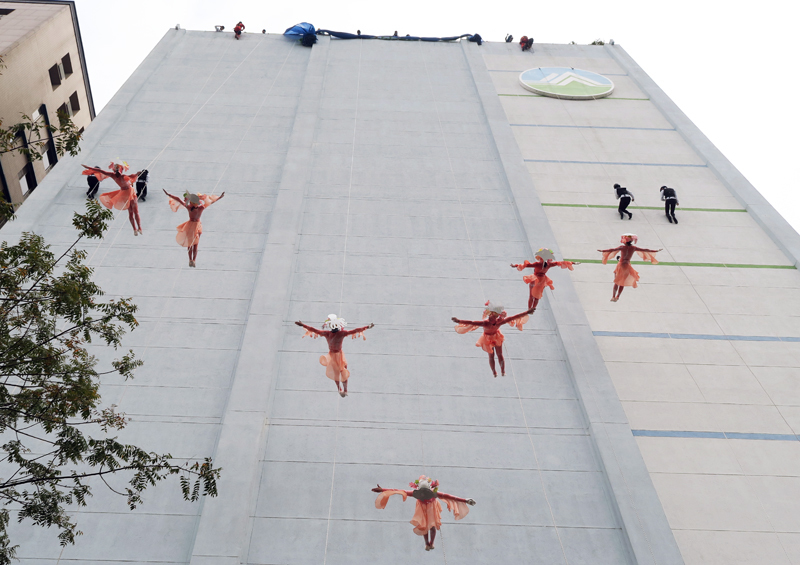 每年有800萬噸的塑膠垃圾流入海洋,占全球海洋垃圾的60~80%,是海洋生態的致命武器。綠色和平11名志工舞者首度和官方單位合作,於環保署大樓外牆以繩索懸吊進行一段空中垂直舞蹈表演,他們平時是上班族,多數沒有舞蹈基礎,經過3~6個月的苦練後才克服各種困難,5日於表演中呼籲社會大眾一起重視塑膠垃圾對海洋生態的危害。