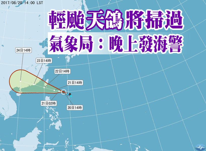 【台灣醒報記者鄭羿菲台北報導】「天鴿颱風在未來2天將可能影響台灣,氣象局最快會在20日晚上發布海上颱風警報。」氣象局預報員顏增璽20日受訪時表示,全台將會有短暫陣雨。天氣風險公司分析師吳聖宇說,「日本在凌晨已發佈天鴿颱風形成的預警,目前距離鵝鑾鼻約800公里,仍朝西北西移動,不排除靠近台灣東南部陸地的機會,但仍有待觀察。」