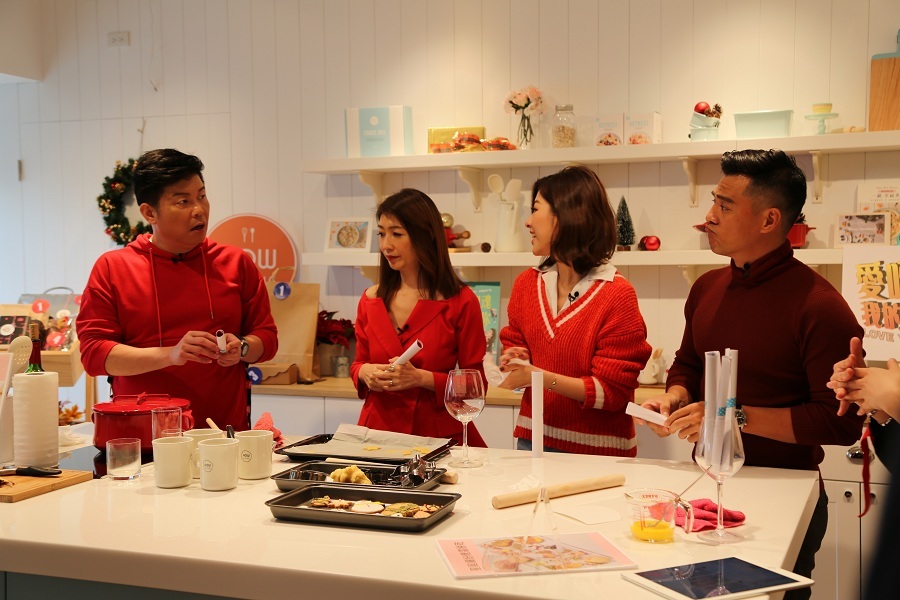 曾國城(左起)、黃嘉千、關詩敏、竇智孔共同製作聖誕傳統飲品「香料熱紅酒」以及手作聖誕烘培。(photo by 洪進安/台灣醒報)