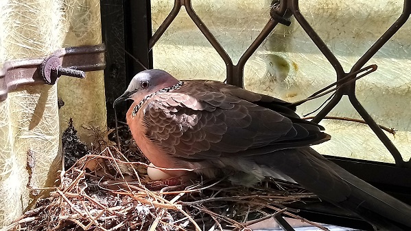 我家靠山邊,又臨著公園,照說斑鳩很容易在野外找到築巢之地,但不知為什麼,去年開始,斑鳩就在我家的陽台角落築巢。我剛開始擔心禽流感,而且家裡又有兩個幼小的早產孫子女,很想把斑鳩的窩巢拆掉。猶豫不決間,斑鳩已經穩穩蹲在巢裡,準備生蛋了。琢磨著,於心不忍,加上氣象報告,颱風即將來襲,遂想,就讓牠們住下吧!