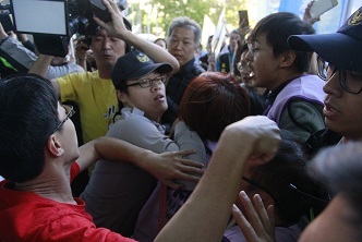 交通部僅由台鐵局運務處副處長彭明光接受陳情,引起工會成員不滿,意圖衝入交通部,與警方爆發激烈衝突。(photo by鄭吉峻台灣醒報)
