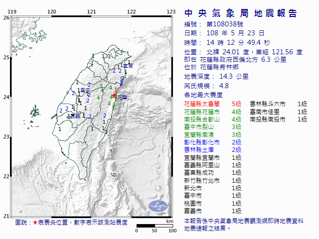 23日下午2時芮氏規模4.8地震為氣象局第38號有感地震,地震深度達14.3公里。最大震度位於花蓮縣5級,其他地區南投縣4 級、 3級為台中、宜蘭、2級為彰化、雲林,其餘1級的有新北、新竹、桃園、嘉義、台南、台東。