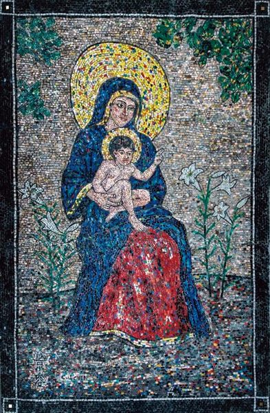 台灣馬賽克嵌畫名家陳景容(1934-)寶刀未老,今以85歲高齡,還遠征東歐羅馬尼亞,以《馬利亞和耶穌的祝福》的名作,分享國際,光耀寰宇。