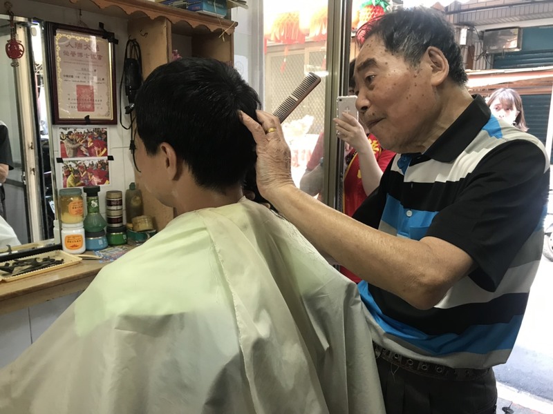 有位年輕人現場讓林能火展現手藝,他先拿起痱子粉拍在他的脖子上,以緩慢但熟練的技巧開始修剪頭髮,從他剪髮時專注的神情,看不出他已高齡百歲。不到10坪的空間裡、一張理髮椅,每周接1至2位客人,他表示他會一直剪下去。