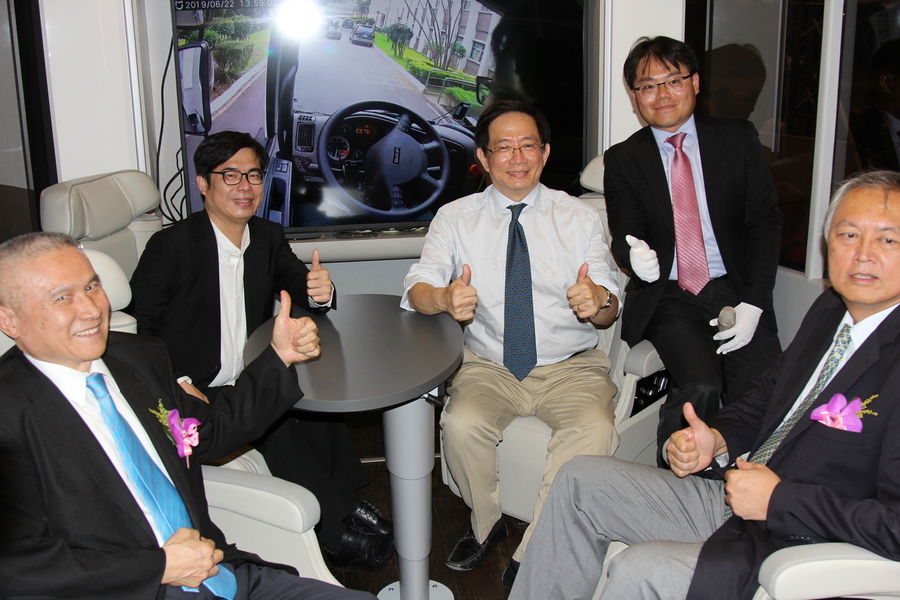 在台大傅鐘前四個單位26日簽署合作備忘錄,由台灣大學校長管中閔主持,連同明志科技大學校長劉祖華、台塑汽車貨運董事長陳勝光、加拿大艾歐圖科技董事長李訓濃,與行政院副院長陳其邁等,手牽手預祝杜拜最終決賽奪魁,為自駕車揭綵並步入車中比讚。