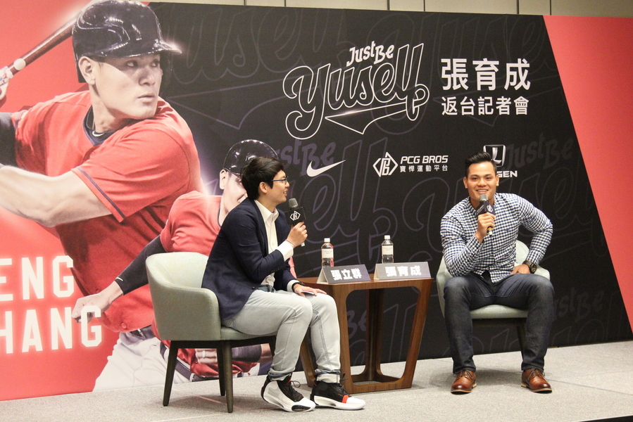 談起大聯盟生涯首轟憶亡父時刻,張育成(右)在記者會上激動灑下英雄淚。(photo by 祝潤霖/台灣醒報)