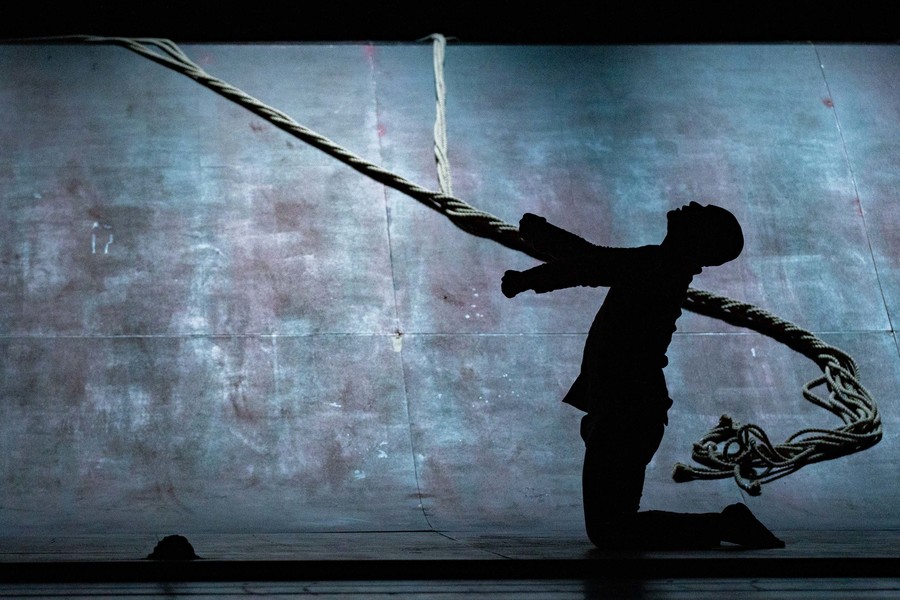 阿喀郎·汗彩排《陌生人》,繩子象徵一戰時期殖民地傭兵於戰地對接電纜之意象。(photo by國家兩廳院)