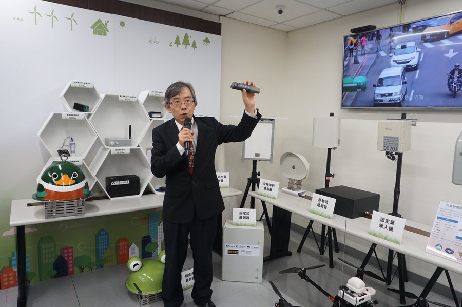 環境監測及資訊處長張順欽處介紹4項新投入環境監測的環境物聯網感測器:1.以「無人機」結合「感測器」的大氣剖面監測無人機,可探測「高空污染物分布」,並解析其對地面的影響。