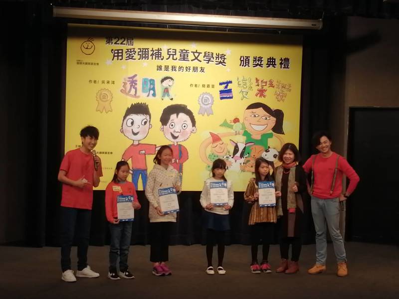 「用愛彌補」兒童文學獎已邁入第22屆,本屆的主題為「誰是我的好朋友」,共有112件投稿作品,投稿資格為小三至小六的學童。8日於台大集思會議中心舉辦頒獎典禮,其中金獎和銀獎的作品是由得獎者和親友共同「演」出來。