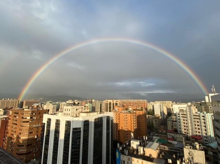 巨型彩虹是台北東側水氣雲量偏多,陽光照射雲滴,經過折射和反射後所產生的美景。(photo by 前財政部長劉憶如)