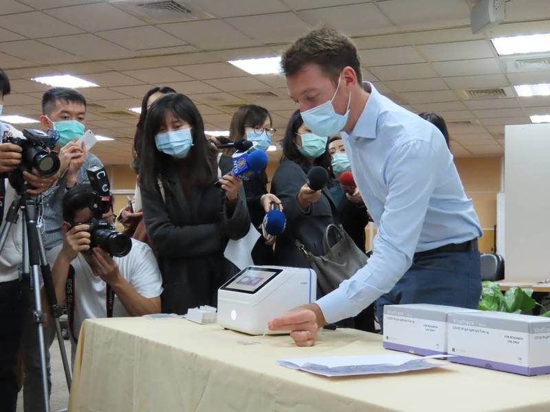 謝達斌表示,柏勝生技是科技部萌芽計畫衍生的跨國新創公司,生化研發基地座落在丹麥哥本哈根,而軟硬體研發中心與設備生產則位於台灣桃園,結合台灣IT產業優勢,開發出可攜式醫療檢測平台,未來可適用於機場、港口等第一線防疫場所。