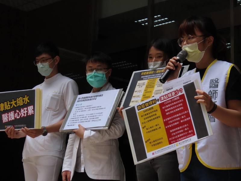 「台灣的防疫成果是建立在醫療人員的血汗上嗎?」台北市醫師職業工會秘書長廖郁雯表示,衛福部長陳時中3月6日曾表示,為了慰勉防疫人員的辛勞,將比照SARS期間,發給醫師每日1萬元、護理師每班1萬元津貼,豈料4月24日公布的獎勵措施,卻是多人分攤這1萬元,「比SARS還不如」,令不少醫療人員心寒。