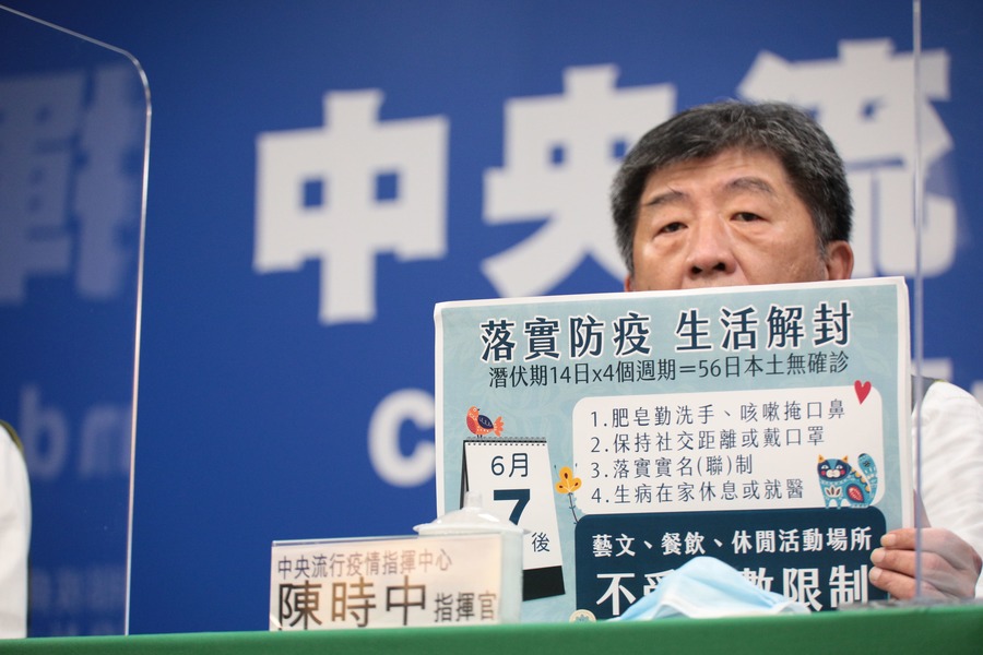 中央疫情指揮中心26日召開記者會,指揮官陳時中宣佈零確診,並表示在國內疫情緩和的情況下與行政院討論後,訂出一個方向,即為「邊境嚴管、國內鬆綁」。他說:「國內鬆綁時間抓在6月7日以後,到了那天連續8週沒有個案,或只有零星案例的話,就會實施大規模解封。」