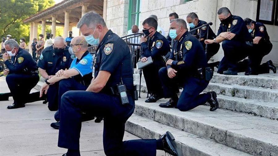 因為非裔男子死亡一案引發的示威抗議,到處都出現暴力破壞的事件,商家被打砸搶,還有警車受困後當街撞人。種種的騷亂,大規模警民衝突一觸即發,然而最早在當地時間5月30日,一名佛羅里達州的警察,竟然在抗議的民眾面前「單膝跪地」,這一幕不明究裡的人可能會認為是警察向民眾道歉致意。