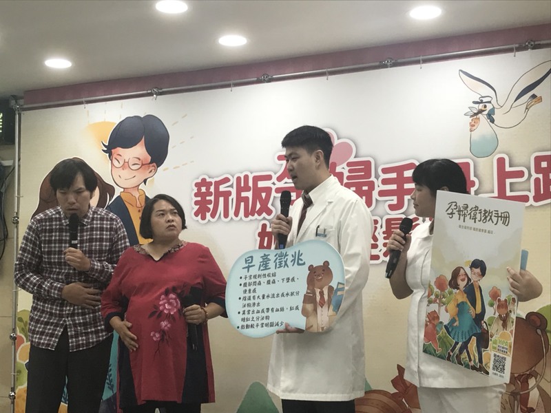 記者會上,國健署特別請來大腳丫劇團表演短劇,藉由劇中的孕婦,列舉出高齡姙娠容易面臨的健康風險,包括姙娠高血壓、糖尿病和早產等,再由護士貼心叮嚀:「只要定期接受產檢,隨時注意身體狀況,就不會有太多的問題。」強調了定期產檢的重要性,化解高齡孕婦過多的憂慮。