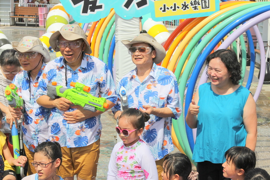 「噴市長!噴市長!」許多參加開幕典禮的小朋友,見到柯文哲都相當興奮,開心地拿起水槍「攻擊」柯市長;柯P也收起平時嚴肅的一面,跟小朋友玩成一片,露出童心未泯的笑容,著「阿北裝」,不畏「槍林彈雨」奮力還擊,更帶著小朋友們一起闖過「套圈圈」水隧道,在炎熱的太陽下享受打水仗的暢快。