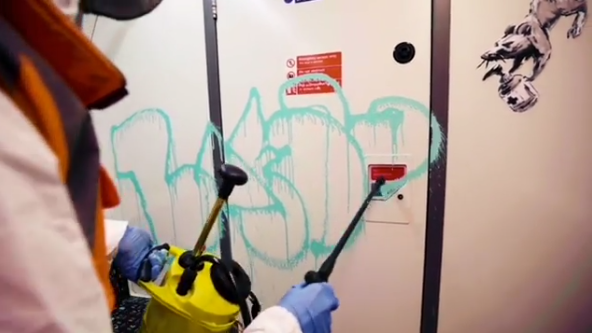 據《BBC》報導,英國神秘塗鴉大師班克斯14日時,在個人Instagram上,上傳了自己偽裝成清潔人員,於倫敦地鐵塗鴉的影片。影片中,他繪製了一隻老鼠正在打噴嚏,另一隻老鼠掙扎著戴口罩等一系列圖鴉,也不忘留下自己的簽名在地鐵司機的車門上。