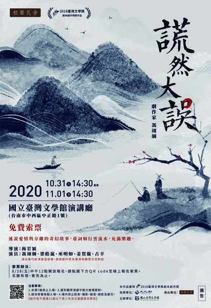《謊然大誤》將於10月31日(六)、11月1日(日)下午2點半演出兩場次,地點於台灣文學館演講廳(台南市中西區中正路1號)。現場舉辦演後座談會,邀請劇作家馮翊綱及導演梅若穎與觀眾交流。28日(五)中午12時起開放線上報名免費索票,數量有限贈完為止。