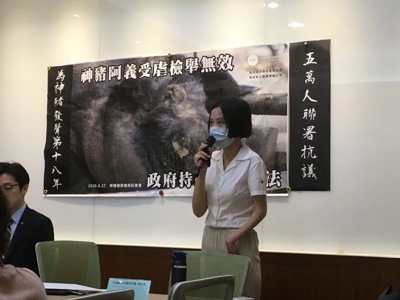 動物社會研究員寸舫筑表示,研究會曾在2019年向桃園市政府、農委會提出影像證據檢舉,包括當年義民祭的特等神豬(阿義)、頭等及二等神豬,一共3隻超重神豬受虐影像的完整紀錄,但政府不但不開罰,還說出「神豬沒有外傷不算虐待」、「主動進食」、養到超重癱瘓是為了「利益最大化」等,為施虐者開脫的辯詞。