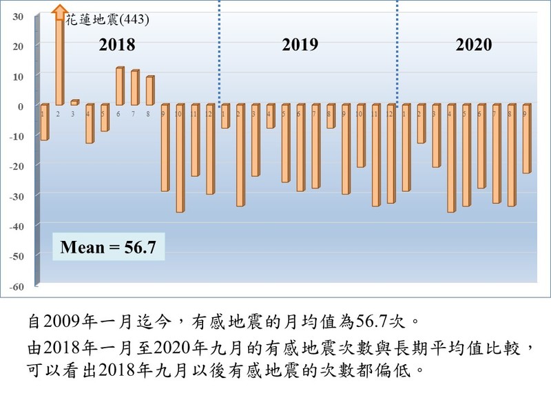 汪中和表示,從2009年1月迄今,全台一個月平均發生約57次有感地震,但據觀測結果,從2018年9月以後至今年9月的有感地震次數平均值為30.8,與長期平均值相比偏低,代表板塊擠壓能量長期未能好好釋放,未來全台發生大地震風險高,「其中以位於擠壓軸線兩側的風險最高。」