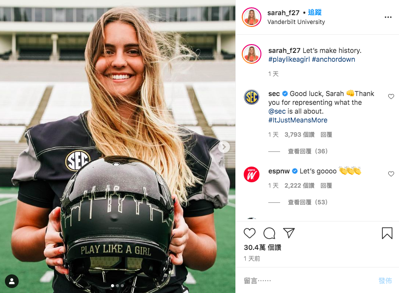 【台灣醒報記者宋秉謙綜合報導】鼓勵女性參與運動!29日凌晨美國大專聯賽(NCAA)旗下美足最頂級的五強聯盟賽事中,代表范德堡大學於下半場開踢的選手是大四的女選手富蕾,她成為美足五強聯盟史上首位女性選手。富蕾登場的片段也在社群媒體上瘋傳,頭盔上印著「女性也打比賽」的標語也成社群熱門關鍵字,富蕾表示,標語是為了鼓勵女力崛起,無論是在體育、科學或是理工領域。