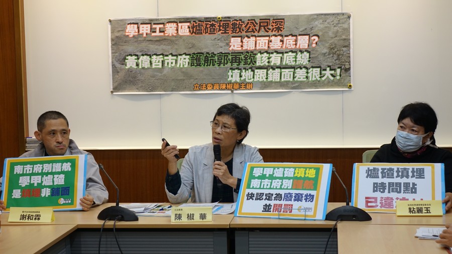 陳椒華委員表示,9月26日工業局已函覆台南環保局,2010年8月修法後爐碴不可作為填地材料,而一般鋪面的基底層僅約20~30公分,如果爐碴填埋2或3公尺多會汙染地下水,也違反《土壤及地下水汙染整治法》,「為何黃偉哲市府官員忽略地下水汙染,還要問工業局掩埋超過2公尺還可稱為基底層?