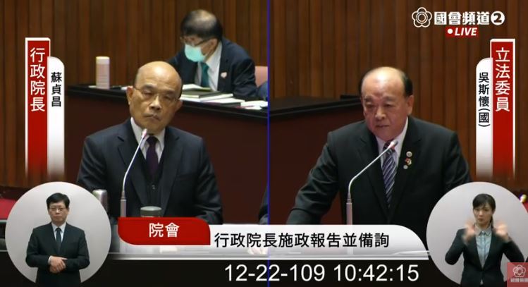 吳斯懷也關心我國疫苗採購進度,他說歐盟、東南亞、美國等國家都開始施打疫苗,或是公布何時可以接種疫苗了,但我國卻遲遲不公布相關細節,國人都不知道我們是否有採購到疫苗,接種疫苗時間與優先順序分類等事項都不清楚,他說很多民眾都打電話跟他反映,因此希望蘇院長可以向外界交代。
