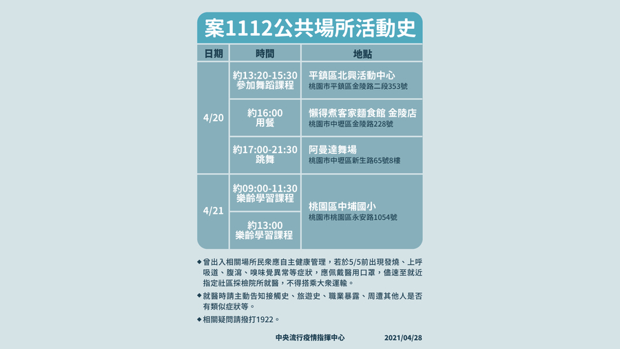 此外,28日再度新增3例新冠肺炎確診機師感染相關案例,為案1112至1114,其中案1112為日前確診的境外移入夫妻(案1068、1106)的非同住家人、案1068的70多歲弟弟,指揮中心指揮官陳時中指出,此一個案的足跡較為複雜,曾前往平鎮區北興活動中心、懶得煮客家麵食館金陵店、阿曼達舞場以及桃園中浦國小等。