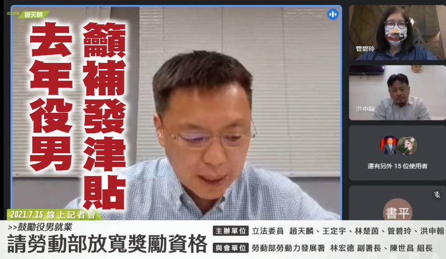 【台灣醒報記者呂翔禾台北報導】「役男為了等兵役就領不到補助,侵害就業權利!」綠委趙天麟、管碧玲等人15日召開記者會,呼籲勞動部將去年6月畢業的役男納入今年的就業獎勵計畫。趙天麟說,去年的計畫制定有疏漏,導致很多等兵役的役男無法獲得補助,這不公平。對此,勞動部勞發署僅表示會再討論。