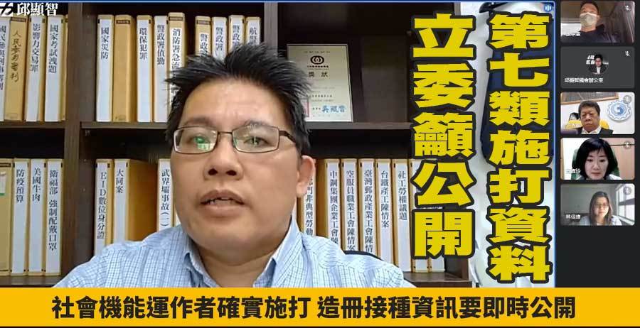 邱顯智表示,早在6月17日就要求指揮中心公布7類人員的疫苗需求數、已施打數,指揮中心雖然表示相關資料已放在網路上,但事實上只有各縣市施打疫苗狀況。他提出兩點訴求:一、施打名單公開透明,指揮中心應儘速公開各類人員造冊數字、已完成施打數及施打率;二、確實接種,儘速安排第7類人員接種,保障一線人員確實施打。