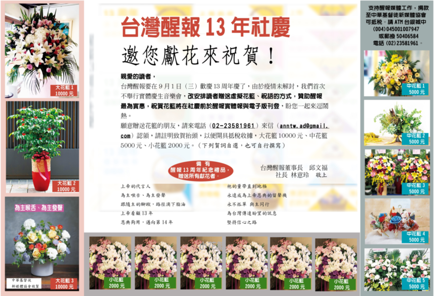 親愛的讀者,台灣醒報要在9月1日(三)歡慶13周年慶了,由於疫情未解封,我們首次不舉行實體慶生音樂會,改安排讀者贈送虛擬花籃、祝語的方式贊助醒報最為實惠,祝賀花籃將刊登於醒報實體報與電子版,盼您來逗鬧熱。