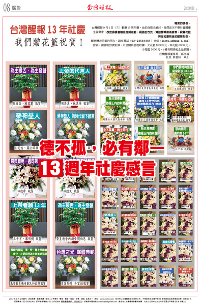 謝謝各界賢達好友在疫情下致贈花籃、來稿美言,讓 這場紙上的 13 周年社慶如此 的漪歟盛哉,好像各位親臨。