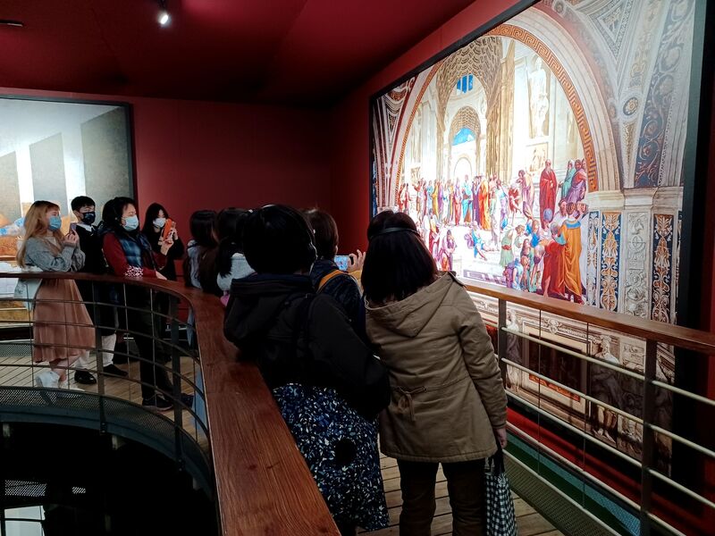 首先映入眼簾的是第1區文藝復興歷史長廊,許多人戴著租借的語音導覽器、站在1:1的巨幅畫像前聆聽解說,與畫中眾多人物相映成趣。該區集結文藝復興早期至晚期代表畫作,引領觀眾了解達文西、拉斐爾、米開朗基羅等24位大師的藝術風采與經典。