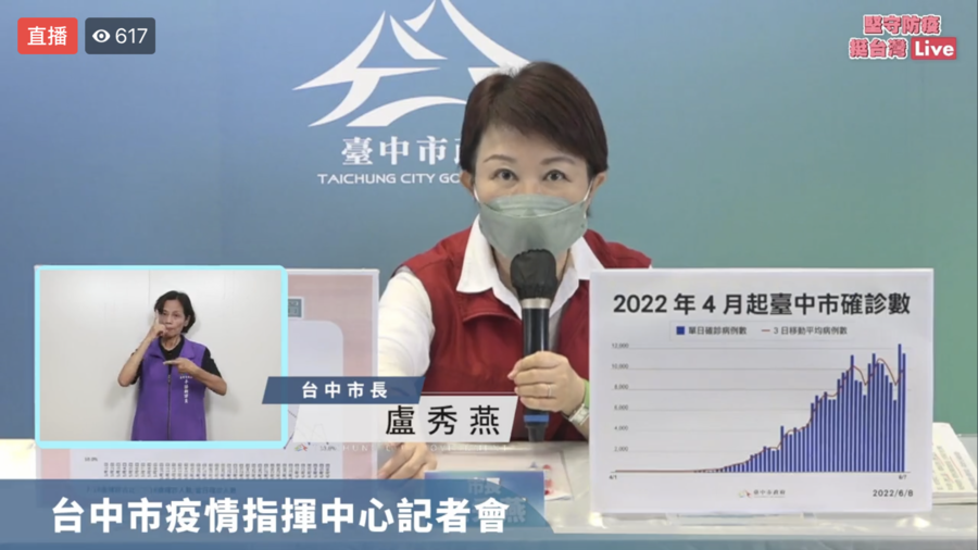 盧秀燕說,8日台中確診人數達11587例,依中央疫情指揮中心及專家預測,這波疫情自4月以來,高原期從北到中南部,目前是中南部高原期,預計台中還要經過1、2周才會逐漸趨緩。不過。自與家長和學校團體討論一後,實施停課不停學措施,讓學生家長決定是否送學生到校,學生染疫率確有下降。