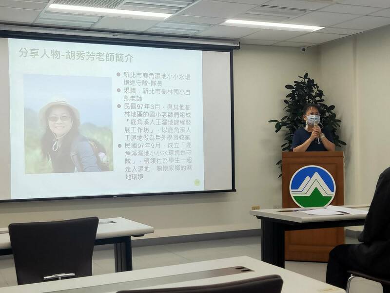 現場也邀請鹿角濕地巡守隊長、新北市樹林國小自然科教師胡秀芳說明巡守隊運作情況。胡秀芳說,鹿角濕地的巡守隊主要由國小4到6年級組成,但團隊的工作坊也會有國中生、高中教師參與,並透過製作「如何清理河川」、「水質檢測」、「濕地生物圖鑑」等L夾、桌遊,讓學生巡守河川時,也能了解環境教育知識。