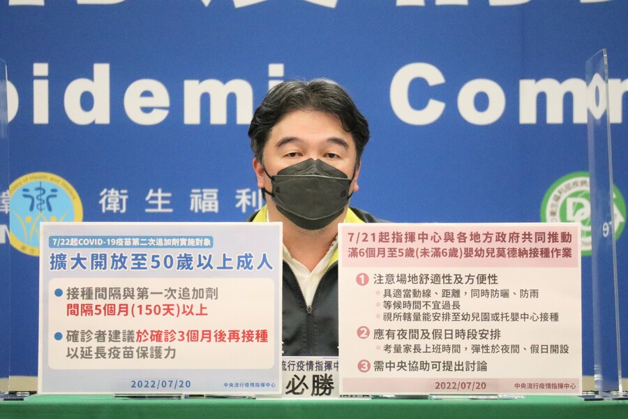 他接著說,21日起,指揮中心也會與地方政府開始推動莫德納幼童疫苗的接種作業,推動6個月到5歲幼童接種作業。王必勝向地方政府呼籲,應注重場地的舒適度與防曬、防雨措施,考量到家長的上班時間,彈性於於假日與夜間開設接種站。