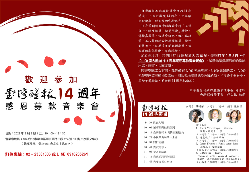 本報即將迎來14 周年社慶,最近公司一面要出報、一面要忙於慶祝音樂會的場地、節目、邀請函與郵寄等地籌備工作,但我們內心充滿感激,誰能想像醒報這個「未達產期就生下的孩子」可以活過14載呢? 捐款成為醒報天使 由於熱心人與支持者的捐款,醒報的深度報導與客觀評論都是免費閱讀的,希望你也能加入「醒報天使」的行列,小額支持。我們會寄給您抵稅收據! 相關新聞 聖誕節到了 慶祝國慶《今日求禱》 (社論)別讓民主遠離了人民