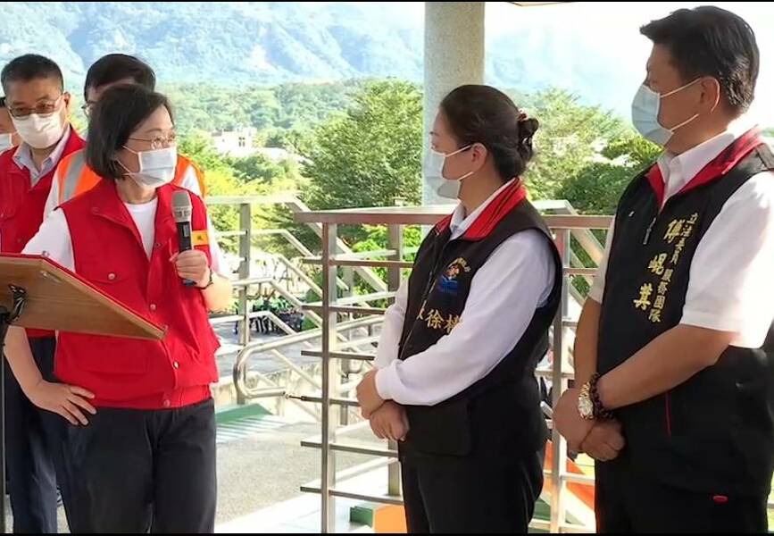 蔡總統在國安會秘書長顧立雄、行政院政務委員張景森、內政部長徐國勇,還有花蓮縣長徐榛蔚、花蓮立委傅崐萁的陪同下,視察受損的玉興橋、玉里高中與東里車站等地,隨即又前往台東與縣長饒慶鈴、民進黨台東立委劉櫂豪會面,勘查萬安國小、關山碾米廠等受災嚴重區域,可謂風塵僕僕。