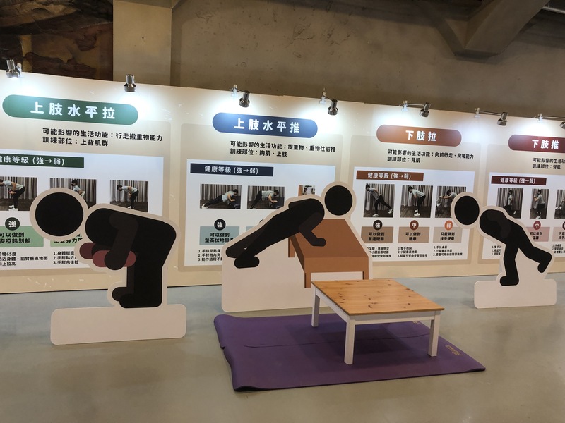 動靜結合的14個展區,動態包含「健體保健室」,透過五個動作檢測能力;「小大人圖書室」,安排高齡者現場說書,拉近代間距離;「Life放映所」還會播放「高年級實習生」、「天外奇蹟」、「我想念我自己」、「102歲破紀錄」、「一路玩到掛」等五部探討老人的電影,並有五位高齡講者做映後分享。