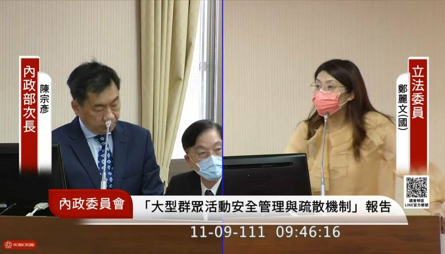 但藍委鄭麗文質疑,梨泰院很多死者是送醫後才過世的,原因是從事故發生到送醫的時間耽擱太久,平常有主辦單位可以空出救護路線,若無主辦單位、群龍無首該如何因應?陳宗彥表示,我國透過替代役訓練而拿到CPR急救證照者已達3萬多人,而災害發生後的減災能力也多有訓練,應可因應。
