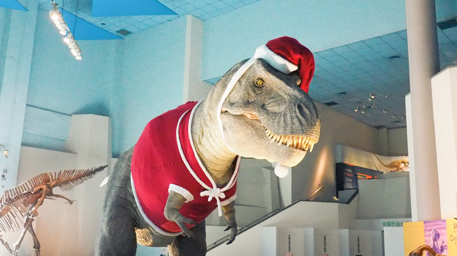 國立科學博物館最受親子歡迎的機械恐龍換上聖誕套裝準備迎聖誕假期。(photo by 國立自然科學博物館)