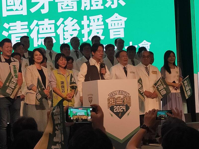 賴清德現身會場時,全場都站起來搖動手中的應援旗,現場旗海飛揚。他致詞時笑說,很多人都提醒他要記得笑,但他過去只要專心做事情時都會忘記笑,未來會好好努力。隨後他也兩度感謝坐在台下的陳時中,在新冠疫情期間對台灣的付出,還有全台灣牙醫師的配合。