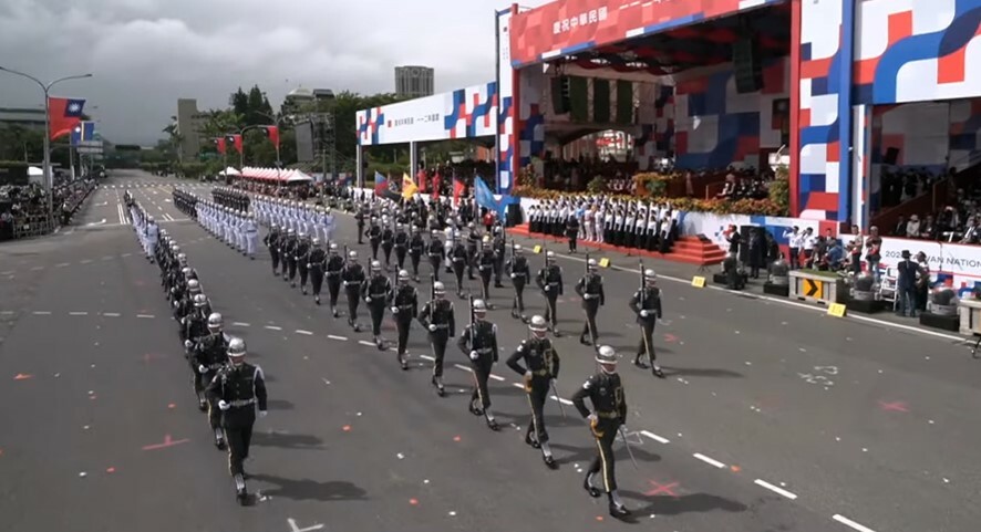 接著 CH-47SD 契努克運輸直升機在空中吊掛巨幅國旗,並由任護衛的 UH-60M 黑鷹直升機慢速經過總統府上方。最後壓軸則有 6 架 AT-3 雷虎機隊以三角隊型衝場飛越總統府上空,並施放象徵國旗的紅藍白彩煙完美收尾。