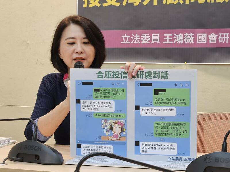 王鴻薇說,當時「合庫投信六年到期新興市場債券基金」傳出又要與Insight簽約,讓基層非常反彈,才開放招標,讓很多廠商前往報告比價,包括「美國霸菱集團Barings」、「法國外貿銀行Natixis」、「香港東方匯理Amundi」等公司,最後曾打算決議讓最便宜的「霸菱集團」接案。