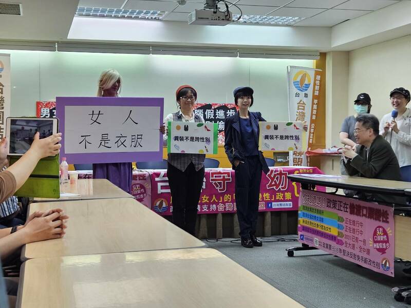 「免術換證」是指生理與心理性別不同者,可以無需經變性手術,即向機關申請變更性別登記。記者會中,台聯祕書長周倪安、不分區立委候選人王思棠和歐陽瑞蓮身著不同的性別服裝,走出來告訴大家,每個人都有異裝的表現自由,但「異裝不是跨性別」,性別不可以像衣服一樣隨意穿脫,傷害女性權益。
