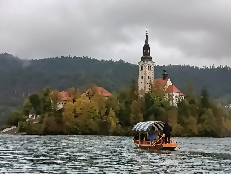 阿爾卑斯山環繞的布雷德湖,是一個堰塞湖,積雪融化產生的冰水以及山間的泉水,不斷注入湖中,所以又稱為「冰湖」。湖長2120公尺,寬1380公尺,繞湖一圈約六公里。觀光季節,各式小船穿梭在小島和湖畔之間。搖櫓的斯洛維尼亞帥哥們,有著高大的體型、親切的笑容,我們裹著雨衣、撐著雨傘,冷得直發抖,雨幕間他那臉龐,卻透著一種怡然自得。