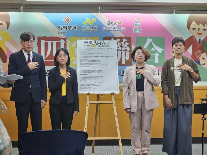【台灣醒報記者呂翔禾台北報導】「台灣需要民進黨以外的本土勢力新選擇!」時代力量、台灣基進、綠黨與小民參政歐巴桑聯盟(小歐盟)9日召開記者會,簽署政黨合作宣言。時力黨主席王婉諭強調,盼四黨合作,在不同選區推出四黨一起背書、能讓民眾毫不猶豫支持的人選,可以不再含淚投票。基進黨主席王興煥也說,希望集結本土在野能量,扳倒亂政藍白。