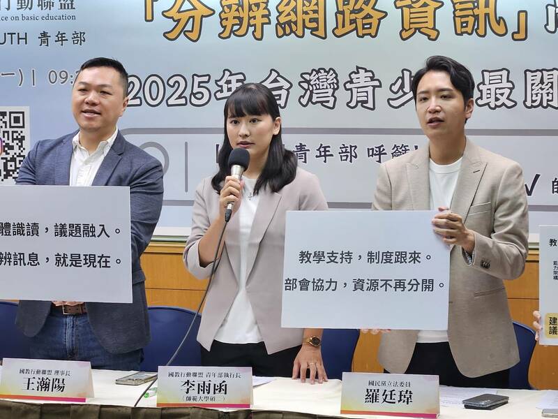 【台灣醒報記者呂翔禾台北報導】「從小沒有人教我們怎麼分辨假訊息,盼教育部將相關課程納入必修、培養師資!」國教盟與藍委羅廷瑋20日召開記者會指出,青年最關心「分辨網路資訊、預防詐騙與錯誤訊息」,但學校並沒有專門課程,呼籲教育部提供模組化教案供老師進修,讓老師也有相關素養。羅廷瑋強調,資訊素養是21世紀不可或缺的品德教育。