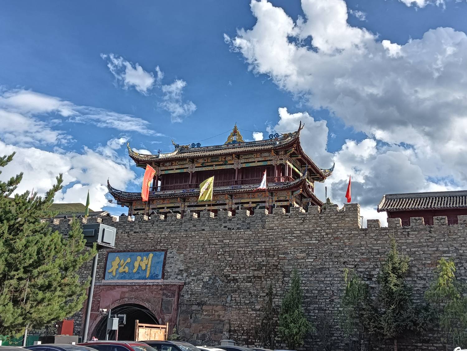 松潘古稱松州,建於唐朝武德元年(公元618年),到了明朝才逐漸增建,自來就是軍事要塞,也是歷史悠久的藏羌回漢等族「茶馬互市」的重要驛站,迄今依然保有民族融合的特色,但以藏族居多。除了城樓,古城門和城牆也是吸睛的古蹟。