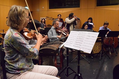 台灣國樂團小巨人絲竹樂團拿起琵琶、二胡,與荷蘭新室內樂團共同演奏〈綠龍〉,在中西樂器相互交鋒下,形塑出歐洲人對「龍」的形象台灣國樂小巨人絲竹樂團與荷蘭新室內樂團11日為即將演出的「跨界新視界」音樂會進行彩...